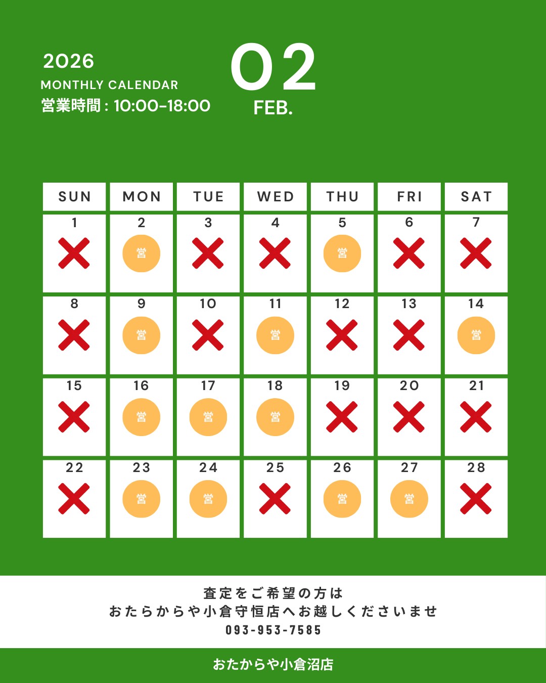 おたからや小倉沼店(FC店舗) 2026年2月店休日のお知らせ