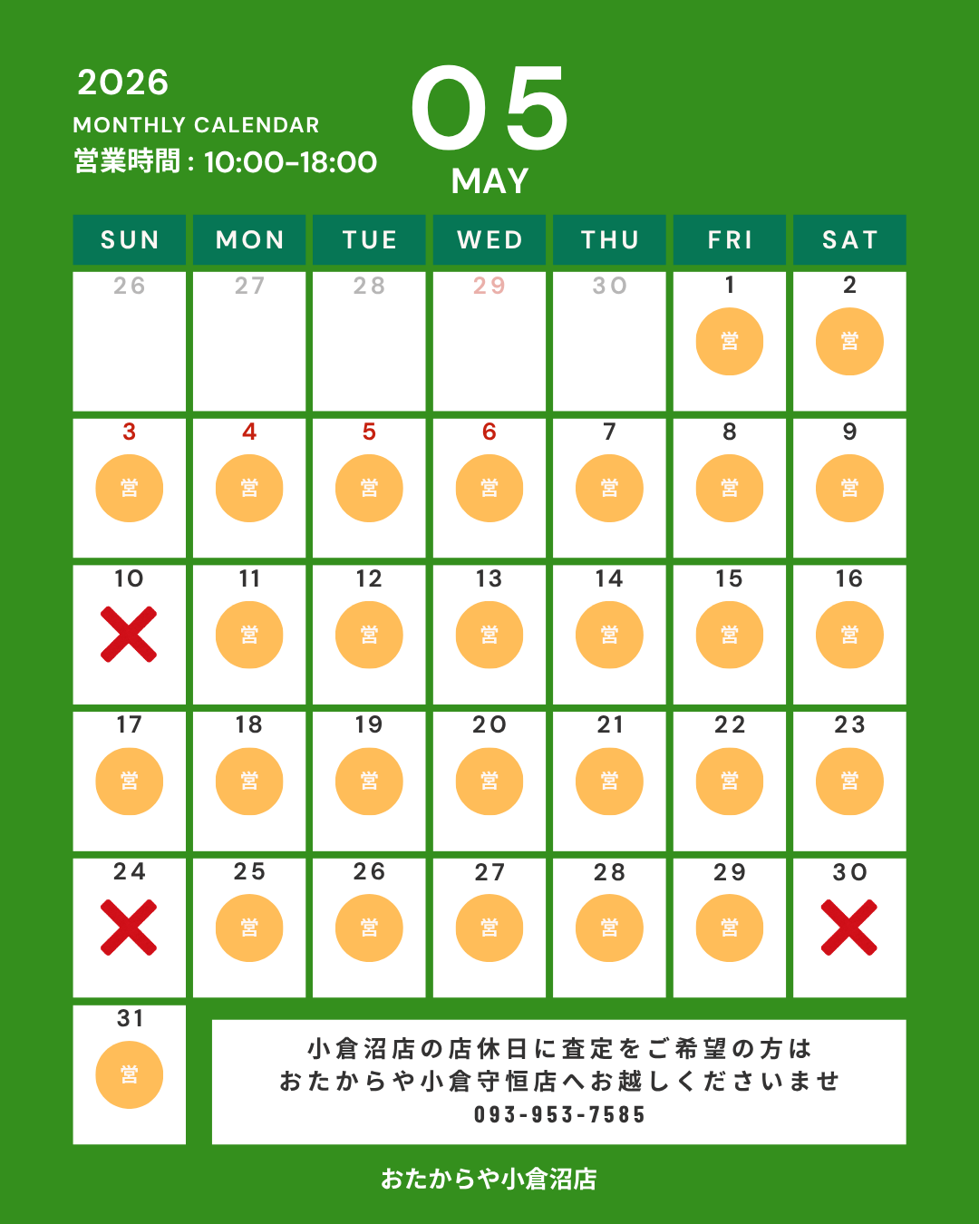 平素よりおたからや小倉沼店をご利用いただき、誠にありがとうございます。