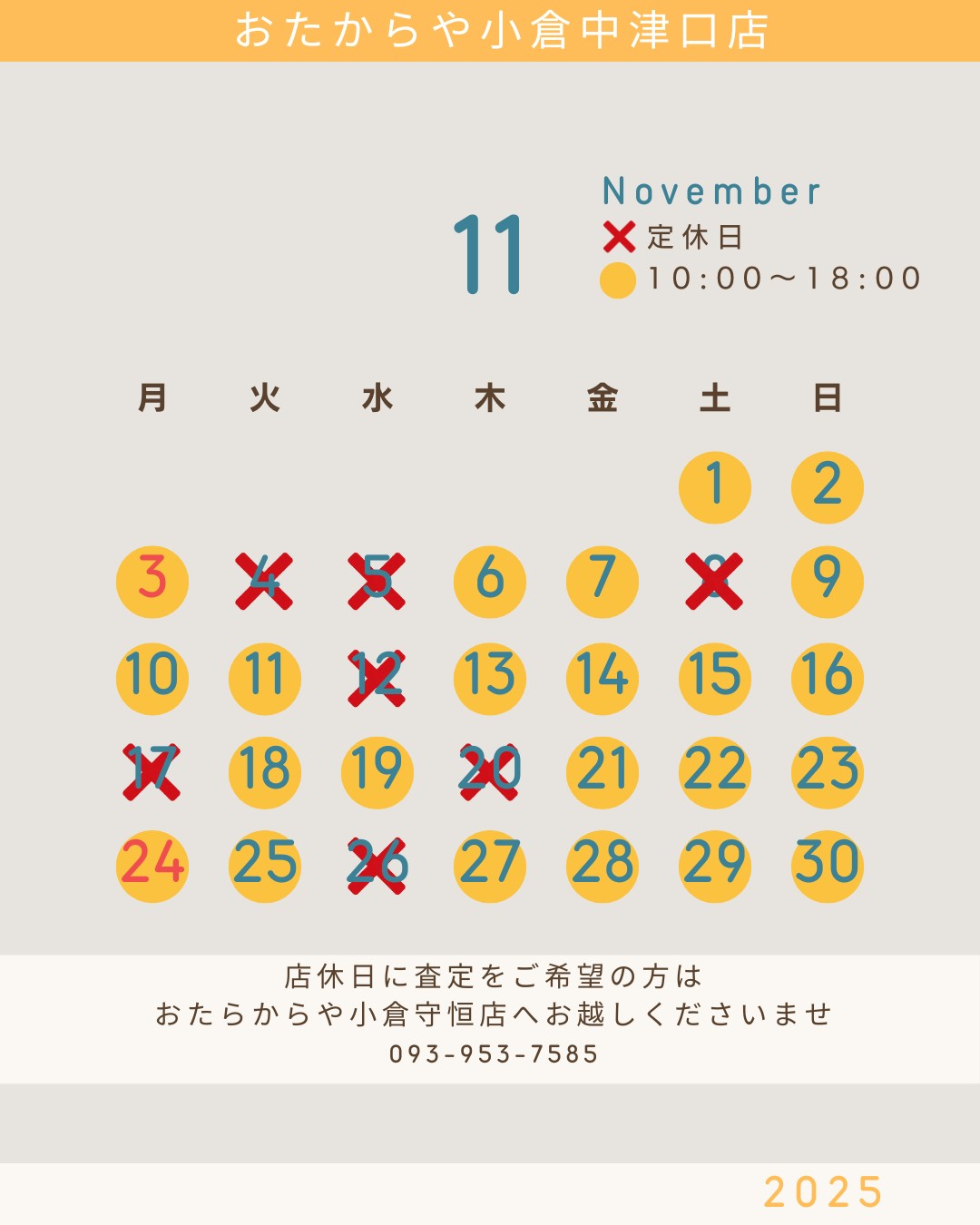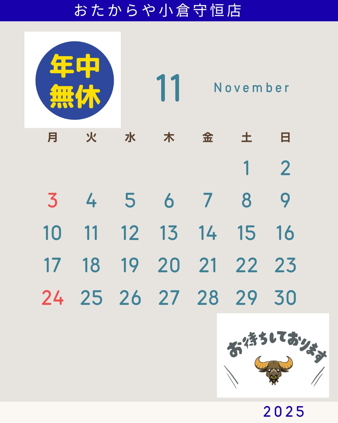 おたからや小倉守恒店(FC店舗) 11月営業日のお知らせ