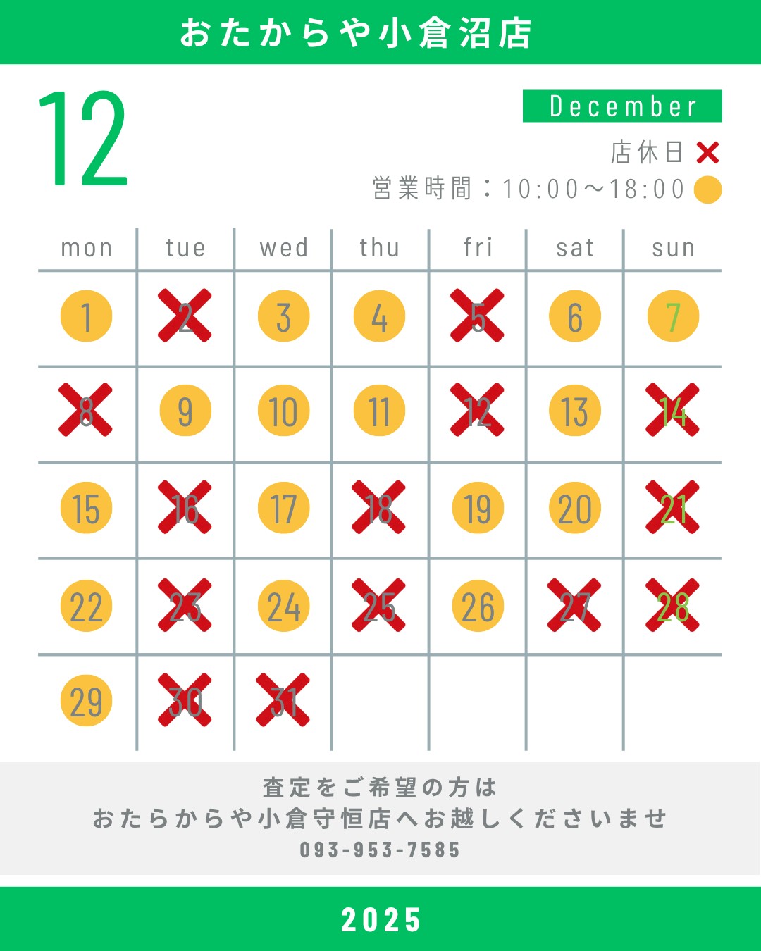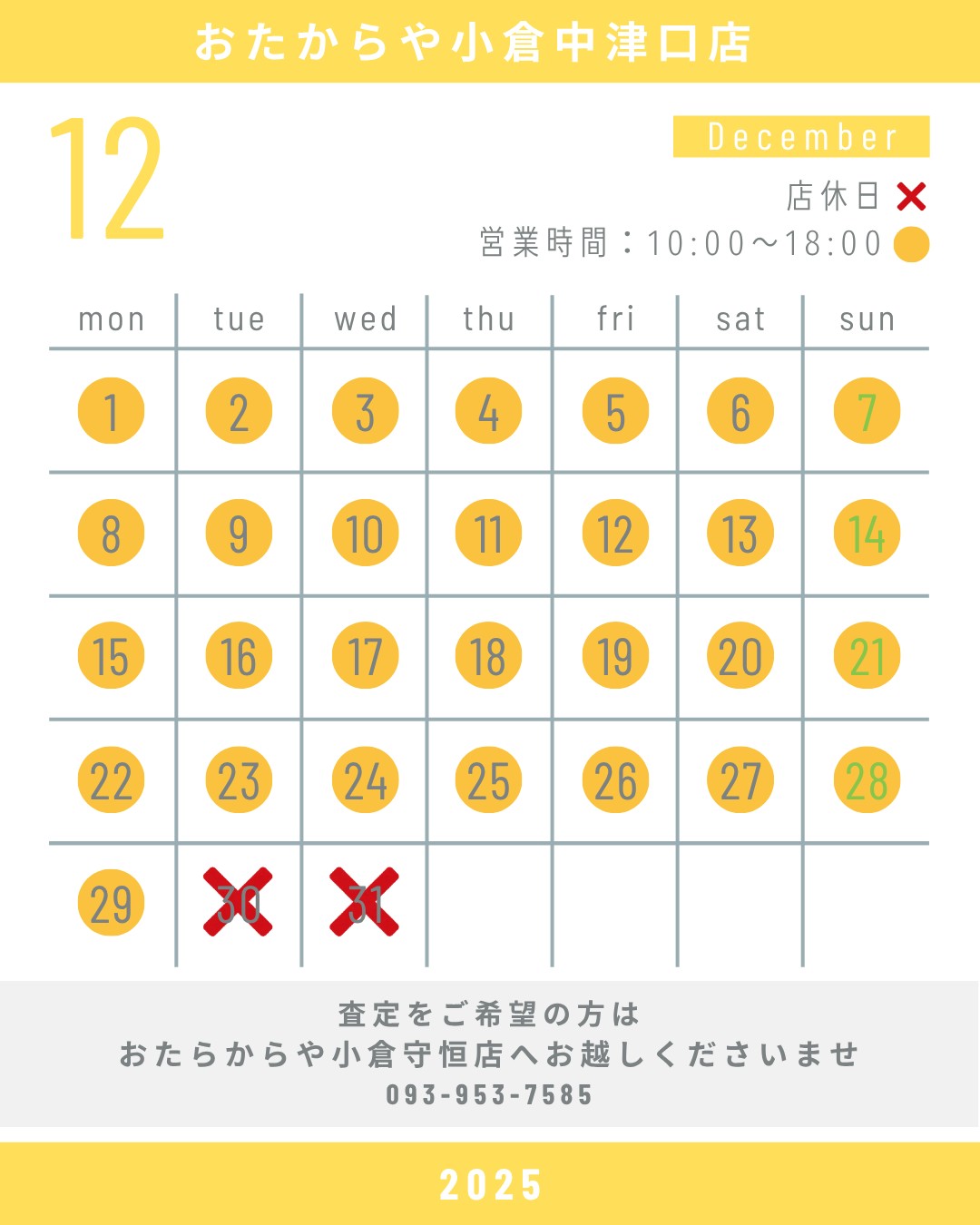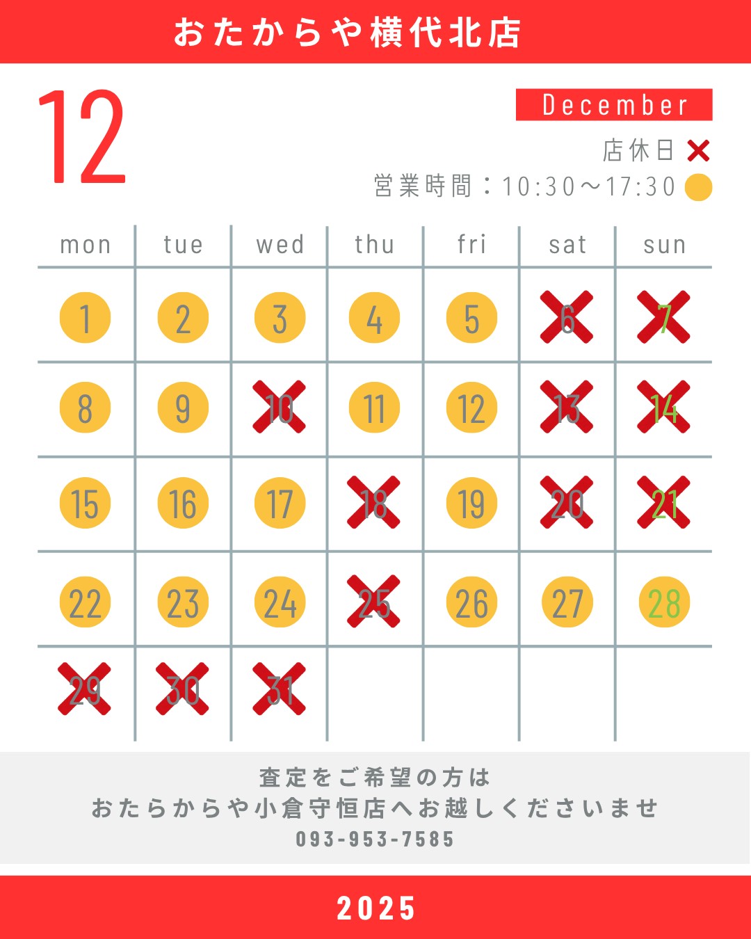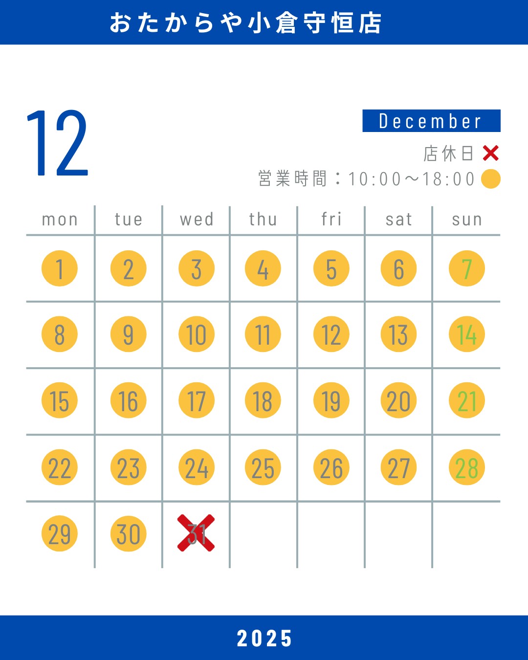 おたからや小倉守恒店(FC店舗) 12月営業日のお知らせ