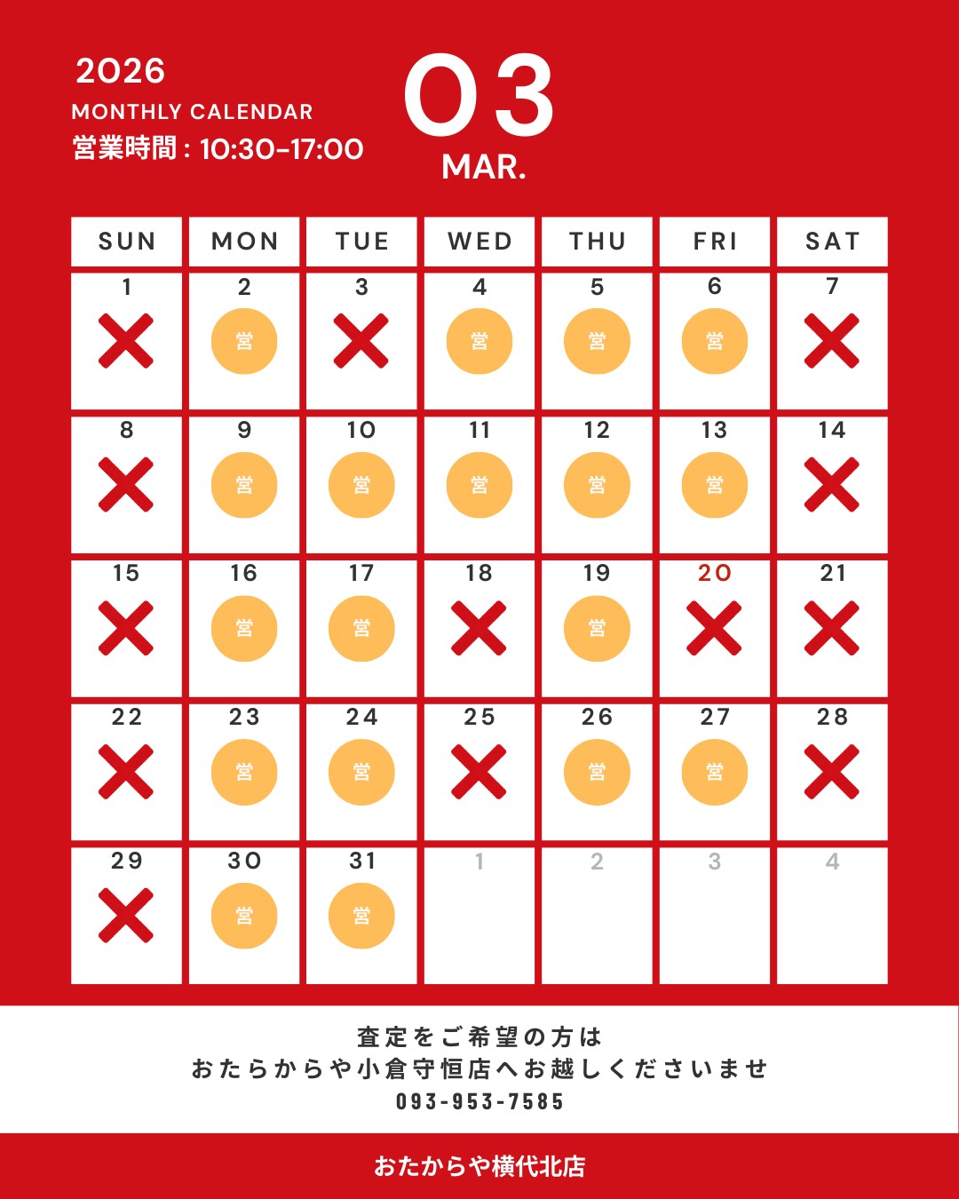 おたからや小倉守恒店(FC店舗) 2026年3月営業日のお知らせ