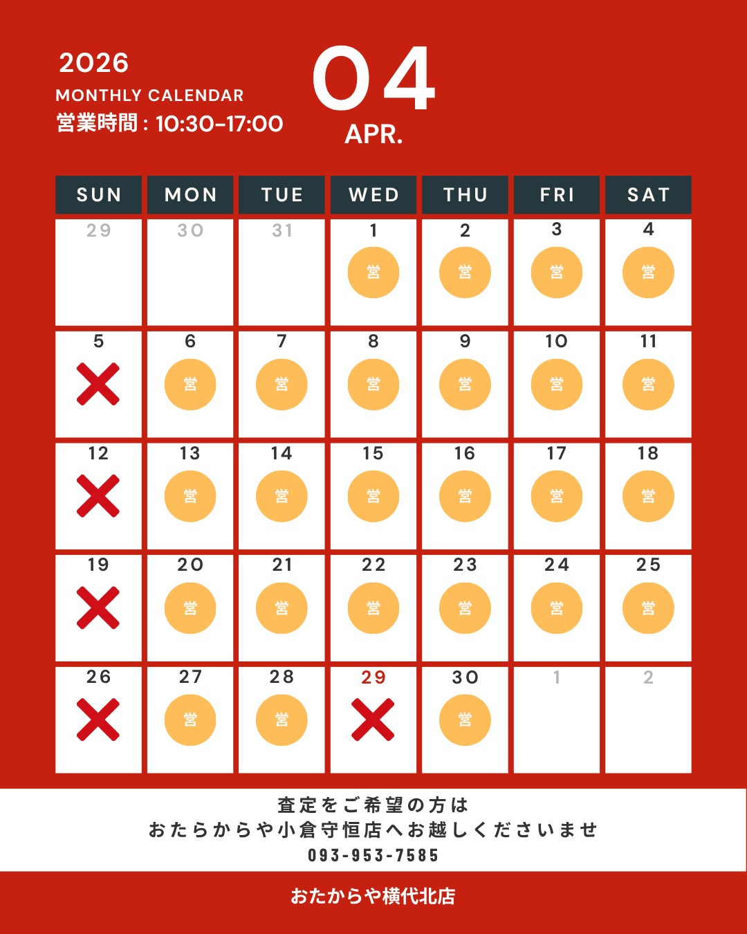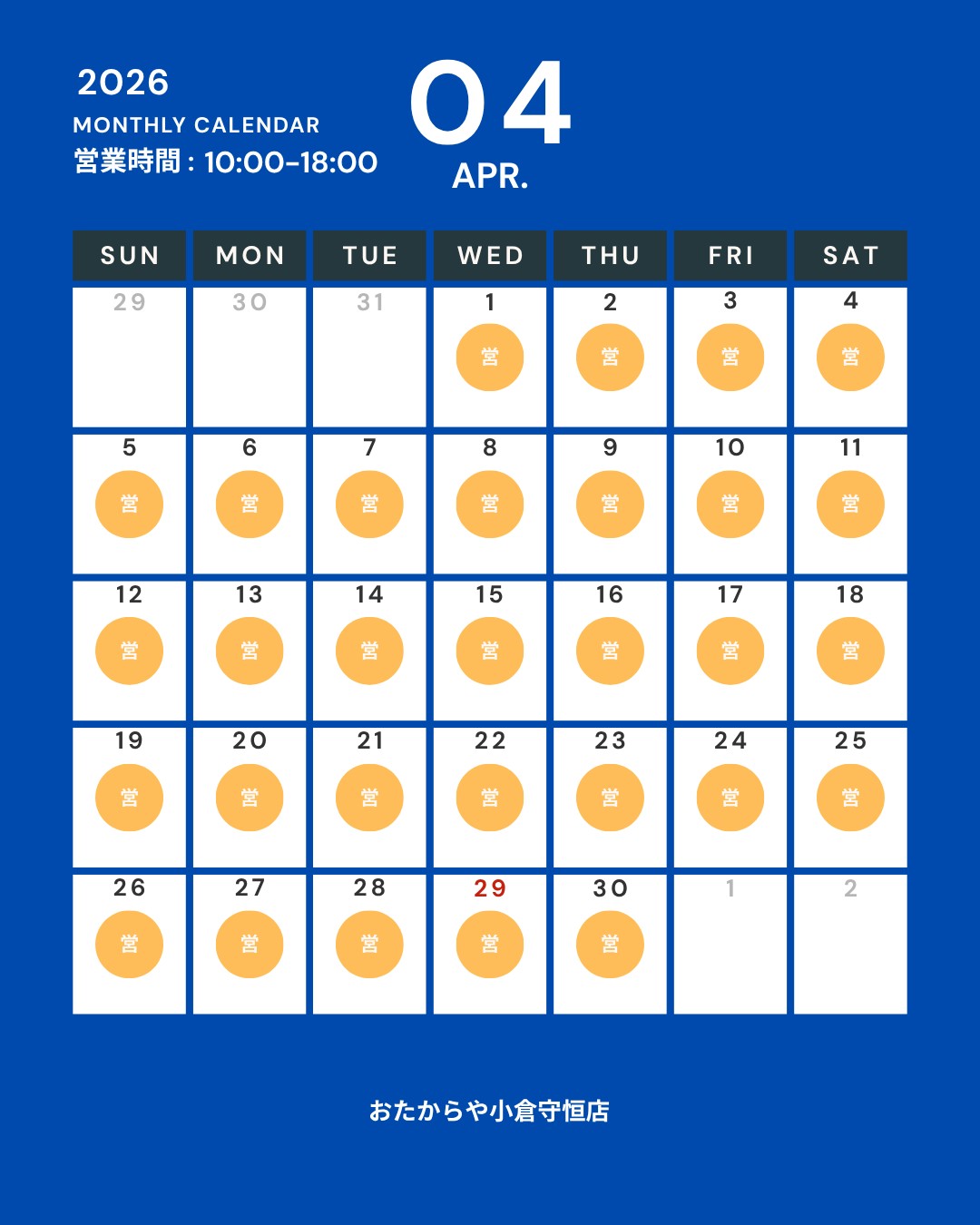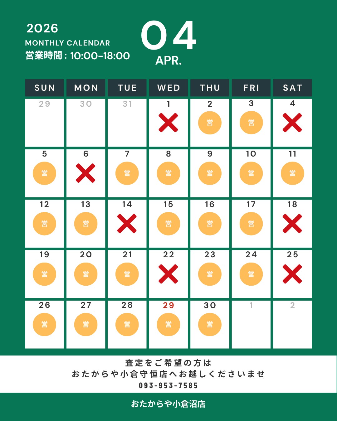 おたからや小倉守恒店(FC店舗) 2026年4月営業日のお知らせ